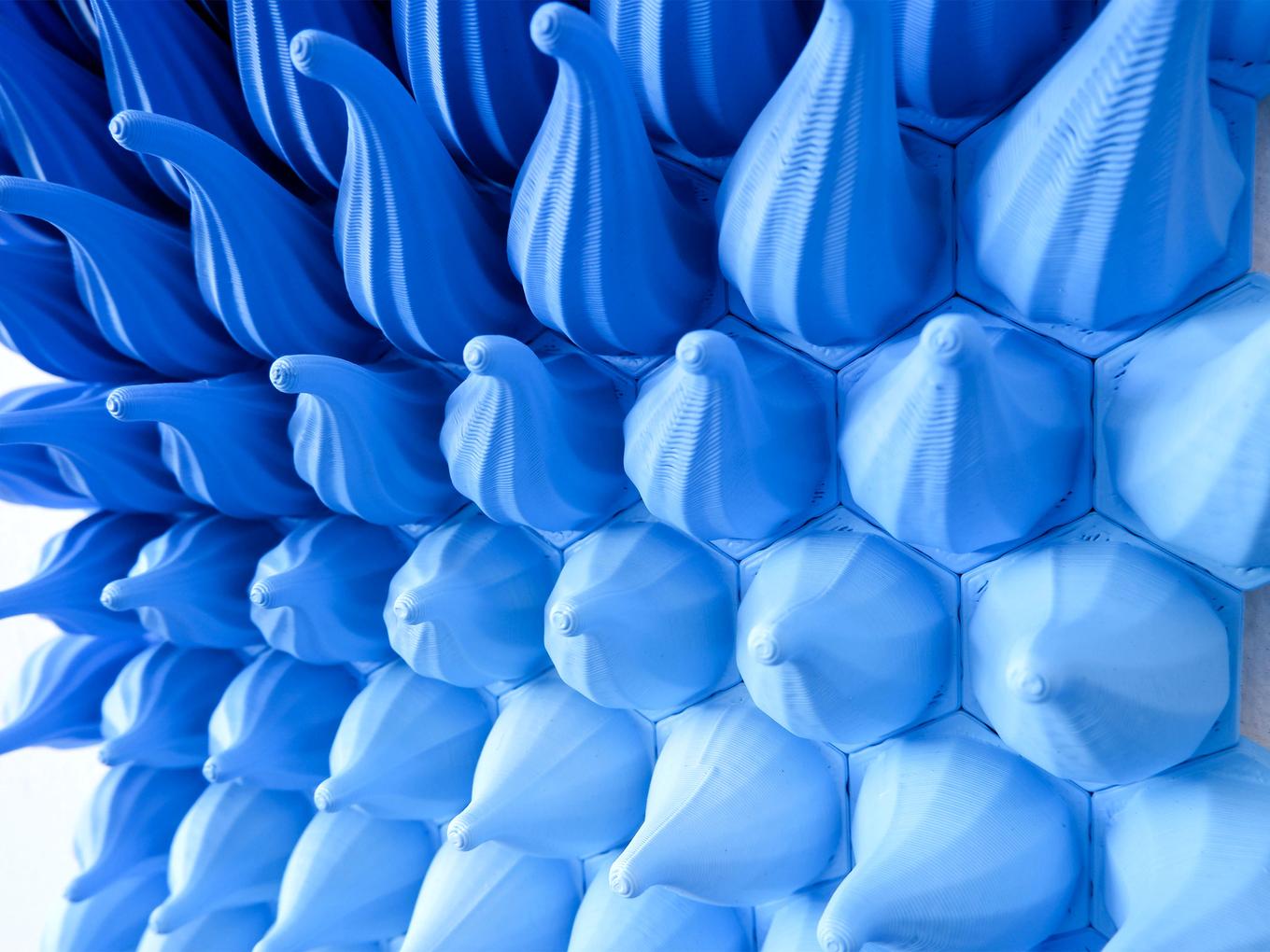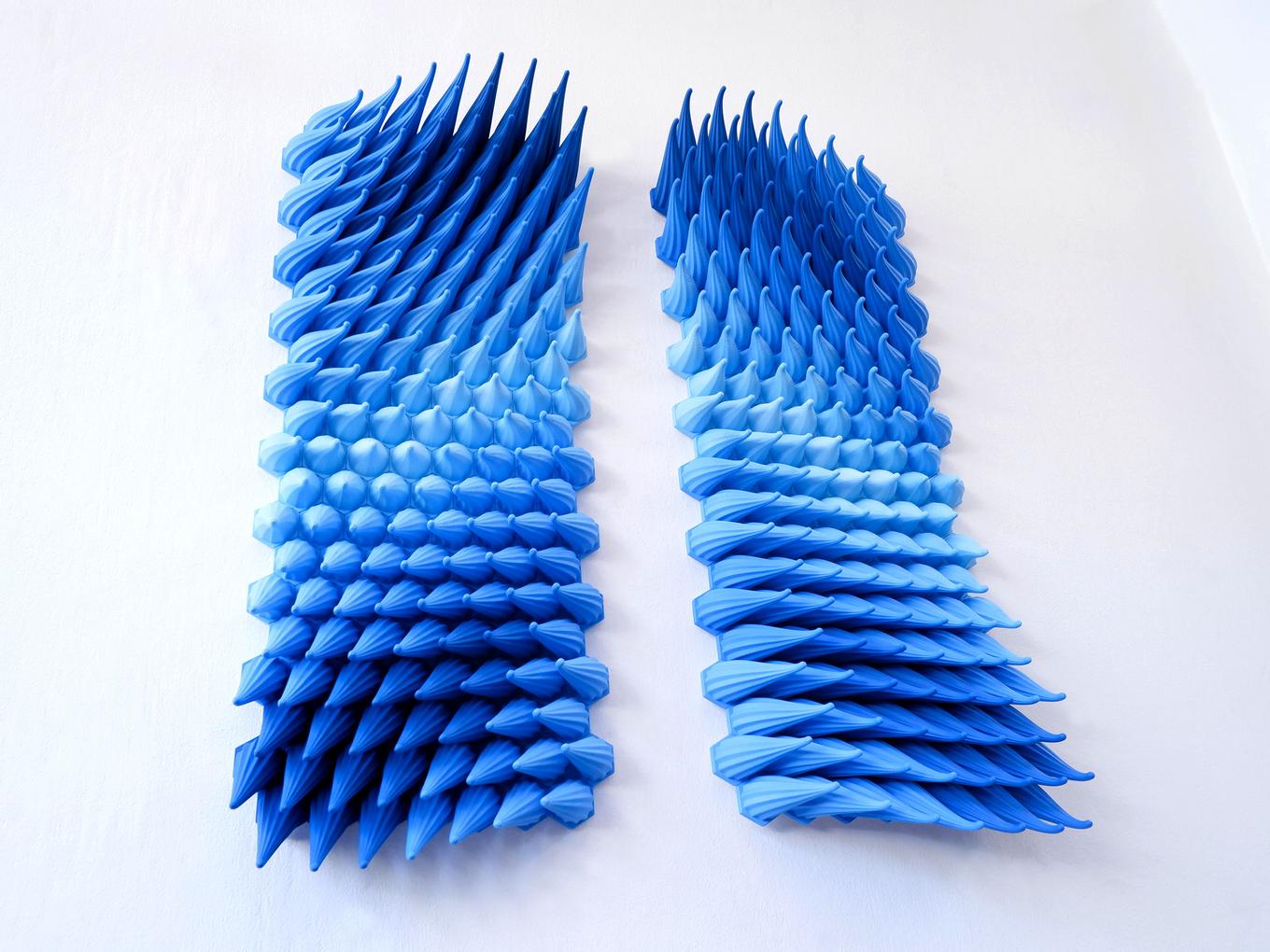 “Diverging Storm” is a mesmerizing set of 3D-printed wall sculpture panels that captures the dynamic energy and movement of powerful air currents. The set consists of two mirrored panels, with a striking gradient of blues moving from a soft, light hue at the center to a deep, dark blue at the edges. The individual pieces of the sculptures create a sense of flowing wind and turbulence, as if the force pushing the pieces is diverging, and the texture of the pieces further enhances this sense of movement.