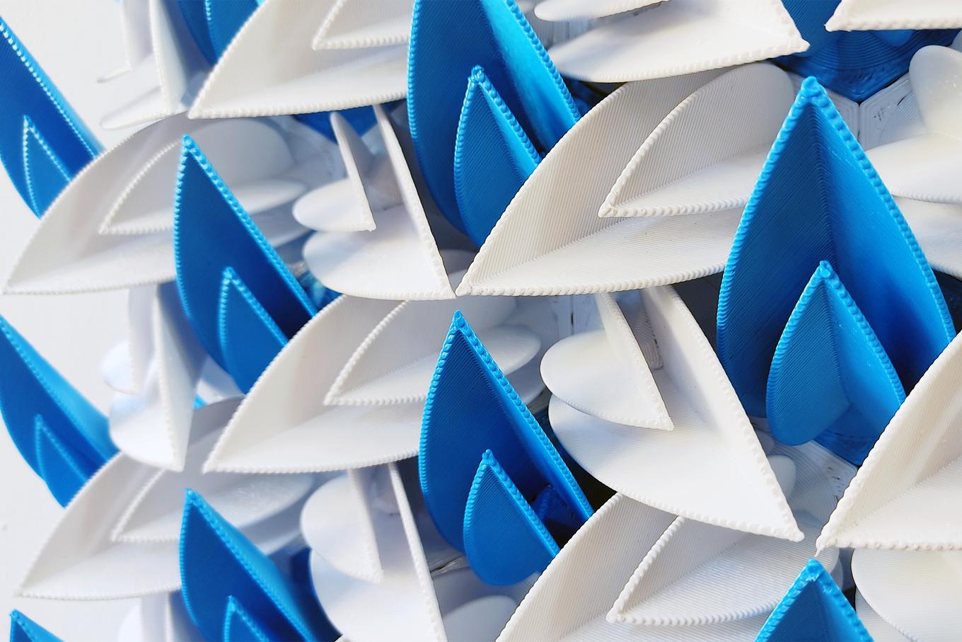 This sculpture is crafted from 73 3D printed forms that are individually hand finished and assembled into an interlocking hexagonal grid.