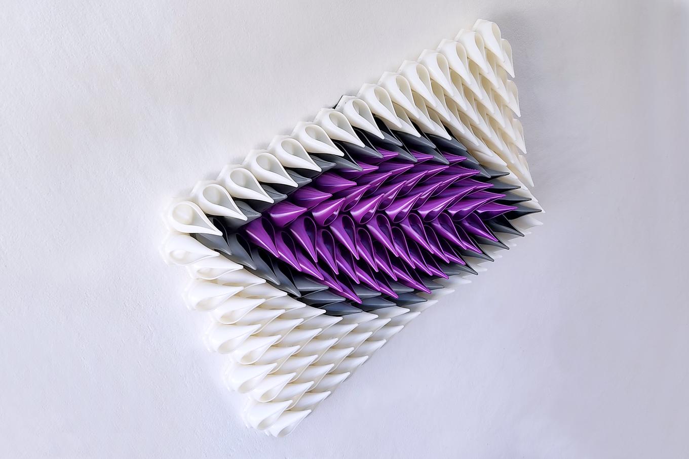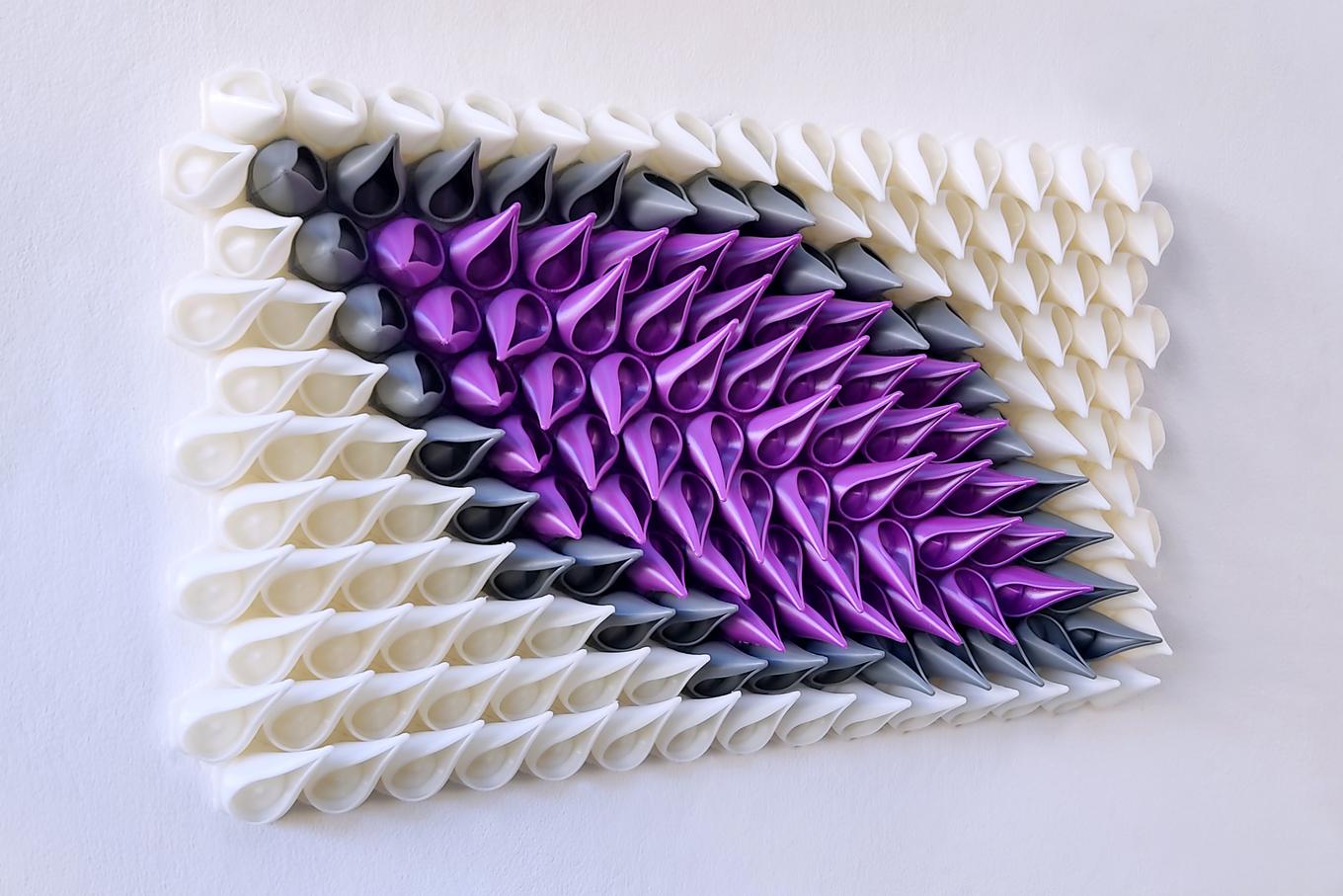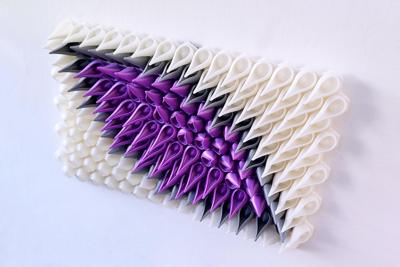 This sculpture is created using a unique computer based process that begins with an algorithm that defines the shapes and relationships between parts. This is known as parametric design, and is what gives the sculpture its unique symmetry and organic rhythm. Next, each of the 170 pieces of the sculpture are fabricated on 3D printers using a high quality eco-friendly plastic filament. Finally, all the pieces are individually hand finished before being assembled into an interlocking hexagonal grid that is sturdy and ready to be hung on the wall.