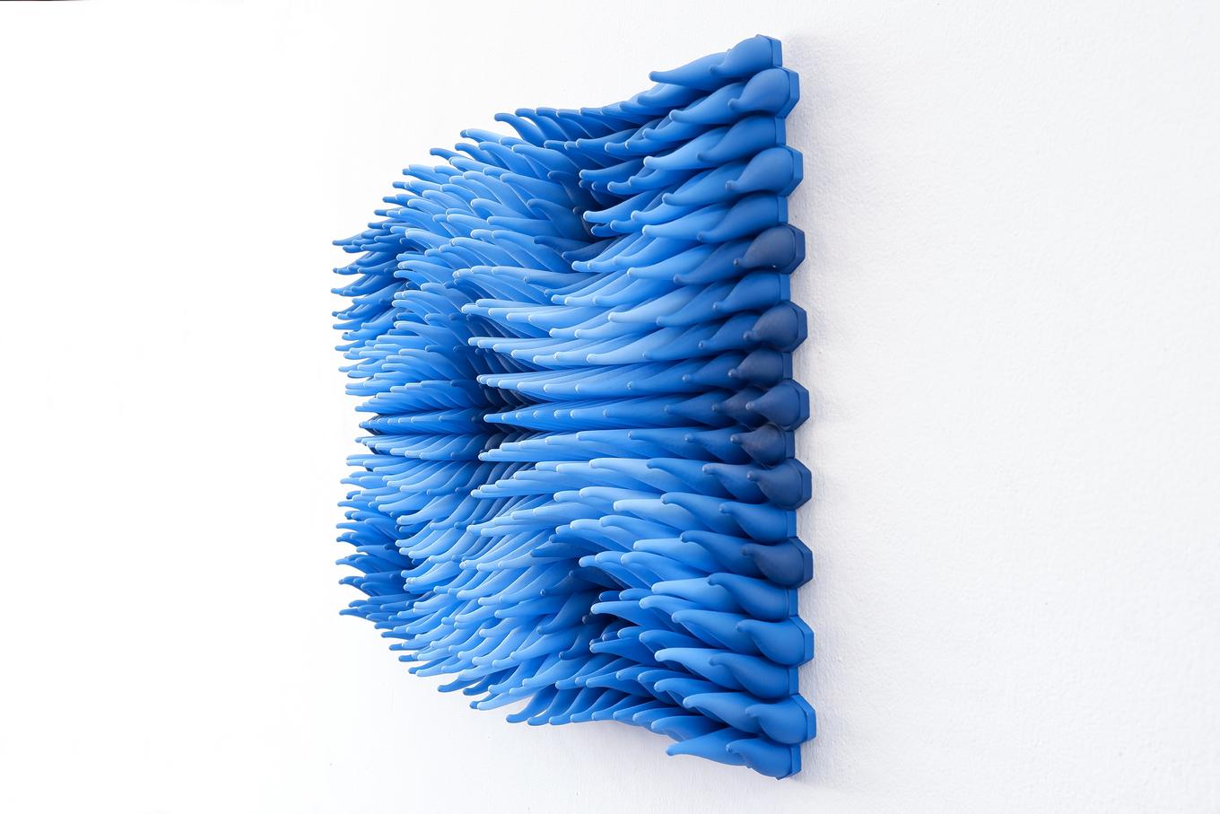This sculpture is created using a unique process that begins in the computer with a parametric algorithm that defines the shape of each of the sculpture’s pieces using the principles of flow and attraction. With the digital model finalized, each of the 484 pieces are 3D printed using a high quality eco-friendly plastic filament. Finally, all the pieces are individually hand finished and painted with a durable enamel before being assembled into an interlocking hexagonal grid that is sturdy and ready to be hung on the wall.